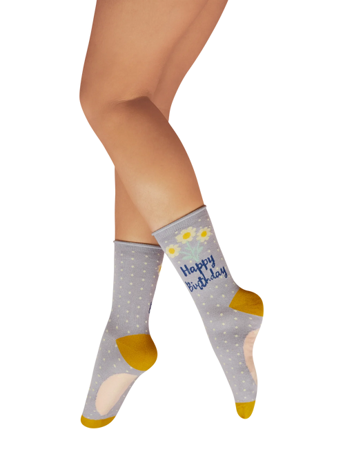 • Ladies Knitted Ankle Socks Happy Birthday Daisies Lilac