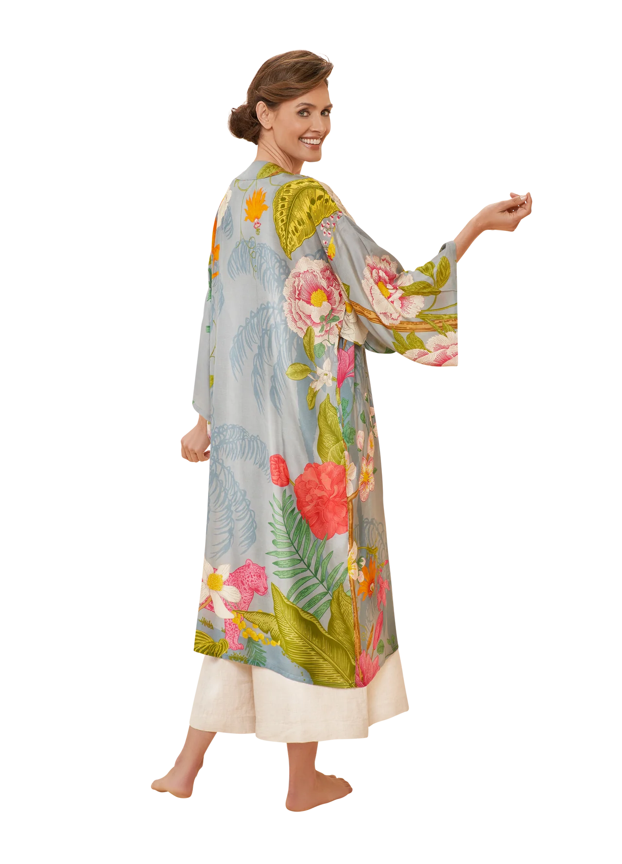 Pastel dreaming? Look no further! Our fabulous Tropical Flora and Fauna Gown in Lavender channels main character energy only. Fabulous florals and jungle friends jump around this glorious design for a look which is both elegant and striking. This can be worn so many ways - combine with a jumpsuit or with your favourite jeans and top combo for effortlessly chic styling.